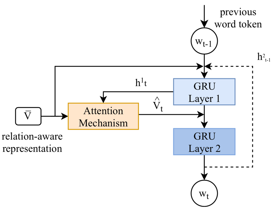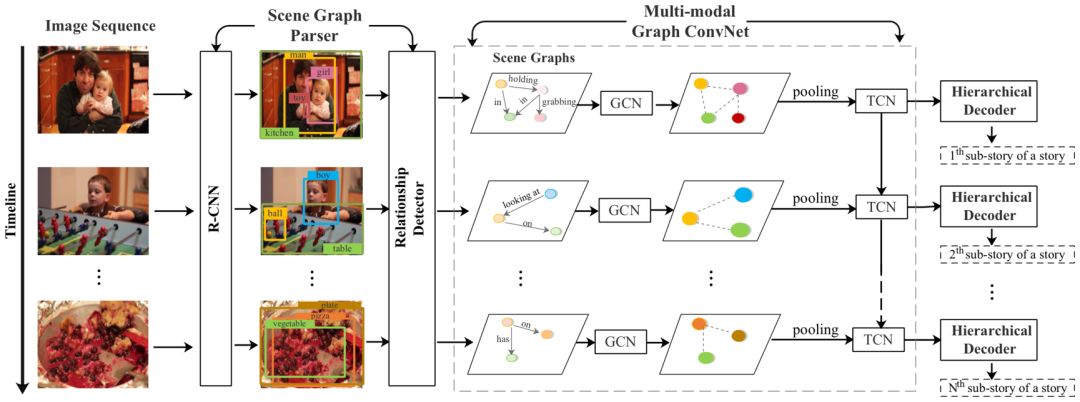 如图2所示,一个男人抱着一个孩子,那么男人和孩子就可以作为图中的节点,他们的视觉关系作为边。接着将场景图通过Multi-modal Graph ConvNet:在图像内的层面,使用图卷积神经网络(GCN)来对场景图中的节点特征进行增强。在跨图像层面,为了建模图像之间的交互,使用时序卷积神经网络(TCN)来沿着时间维度进行卷积,进一步优化图像的特征表示。最后得到了集合了图像内关系和跨图像关系的relation aware的特征,输入到层次化解码器(Hierarchical Decoder)中来生成故事。