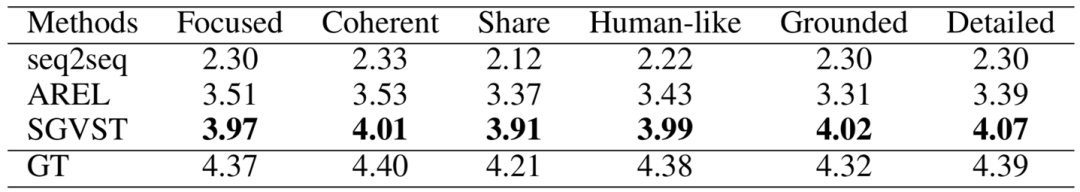 表2:人工评估结果。在AMT上的评估人员根据对每个问题的同意程度来评价故事的质量,评分范围为1-5.