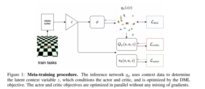 在本文中,我们将针对离线策略学习的行为正则化(behavior regularization)方法,与一个用于任务推断的确定性的任务信息编码器进行结合来解决上述的两大难点。我们在有界的任务信息嵌入空间中引入了一个全新的负指数距离度量,并且将其与控制策略的贝尔曼方程的梯度解耦进行学习。我们分析验证了在该设定下,采用一些简单的算法设计即可带来相比经典元强化学习及度量学习的效果的明显提升。据我们所知,本方法是第一个端到端、无模型的离线元强化学习算法,计算效率高并且在多个元强化学习实验环境上表现出优于以往方法的性能。