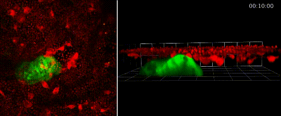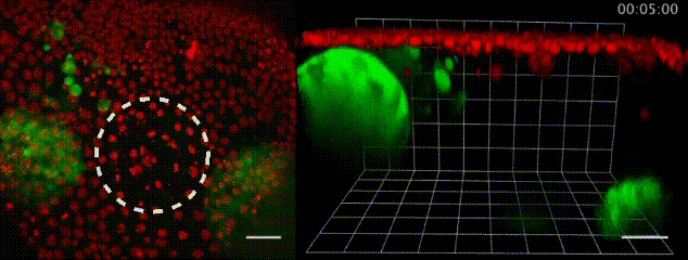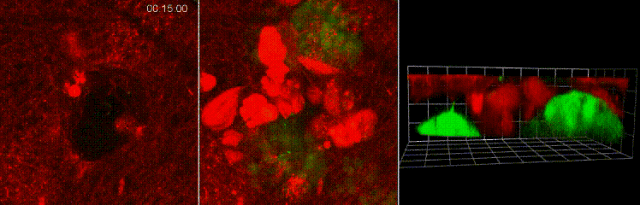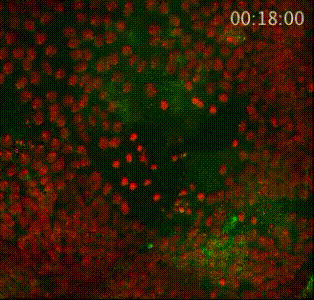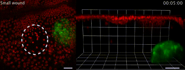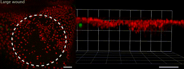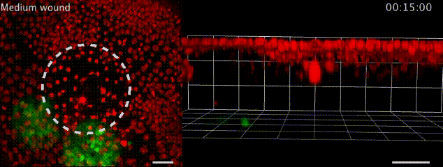 哎~这个事儿有趣了,你看,伤口形成之后,大腹便便的脂肪细胞(绿)就会异常灵活地赶往伤口,用自己健壮的身躯堵住缺损的上皮细胞(红),等到伤口愈合才离开。
