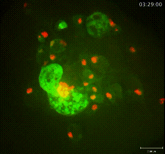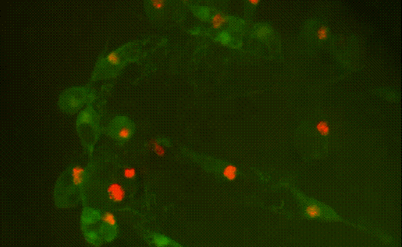 你看,下面就是果蝇身体里脂肪分布的动态图,绿色的是体细胞,橘黄色的是脂肪体。怎么样,小小虫子,也没瘦到哪去吧~