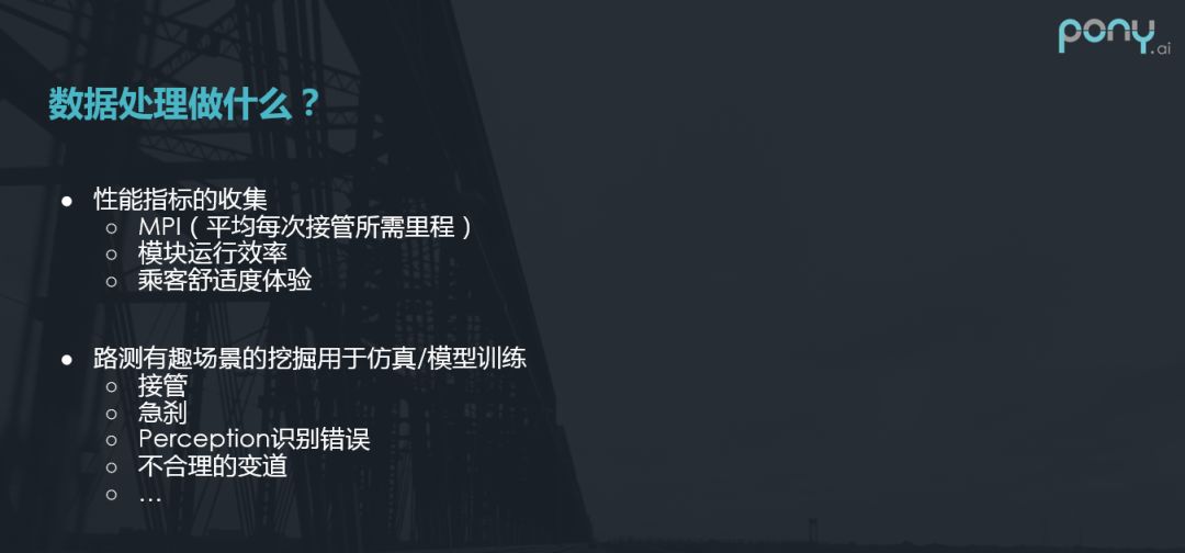 数据处理可以帮助收集性能指标,有 MPI(平均每次接管所需里程)、模块运行效率、乘客舒适度体验等,还有就是路测有趣场景的挖掘,如接管、急刹、感知算法识别、不合理的变道策略等用于模型训练和仿真。