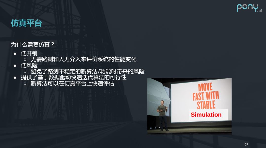 大规模仿真平台,Pony.ai 每天至少会跑 30W 公里的仿真测试(很多自动驾驶公司一年跑的里程可能只有百万级别),这点对于自动驾驶测试来说非常重要。