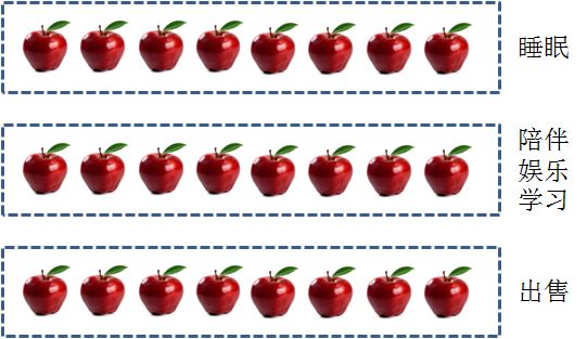 他拿其中8个苹果用来睡眠,8个苹果用来陪伴家人、休息娱乐、读书学习,8个苹果用来对外出售。