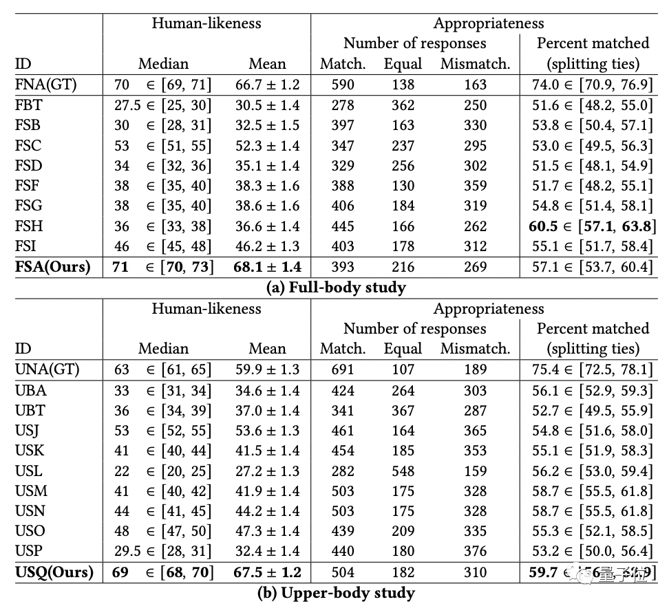 在适当性评价中,该方法在上半身表现中排名第一,在全身表现中排名第二。