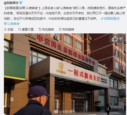 本周,《财新周刊》的封面故事是关于“以房养老”的骗局:上百名老人被“以房养老”诱引入局,终陷债务危机,面临失去房产的绝境。该报道使得中安民生再次登上媒体成为焦点。