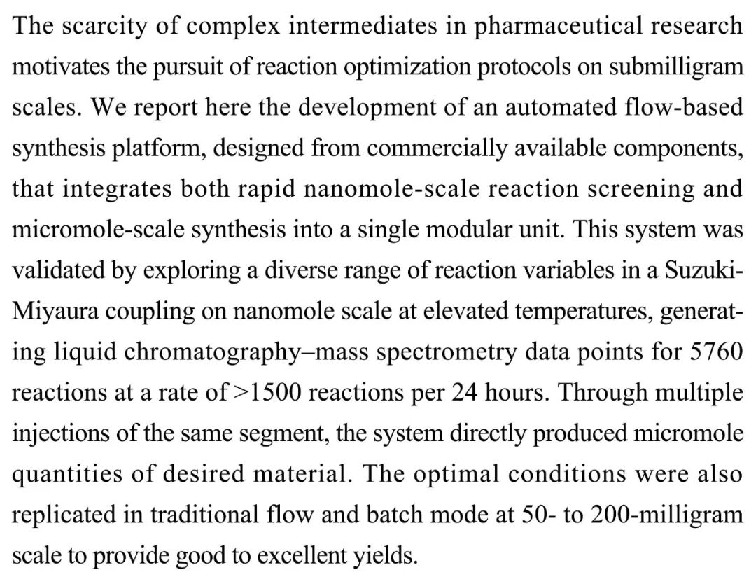 (导读 阿金)药物研究中复杂中间体的稀缺要求优化亚毫克水平上的反应方案。本研究报道一种基于流动的自动化合成平台,将快速纳米级别的反应筛选和微摩尔水平合成整合到同一单元模块中,可以在 24 小时内运行约 1500 次以上反应。通过在同一位点重复注射,新系统可直接制造微摩尔水平数量的目标材料。