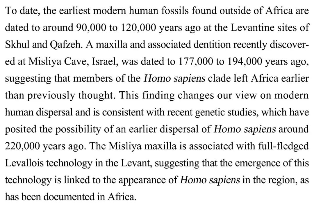 (导读 寒雨)此前,在非洲以外发现的最早的现代人化石可追溯至更新世晚期。本研究在以色列 Misliya 洞穴发掘出一块上颌骨及其牙列化石,将智人离开非洲迁徙的时间提早至 17.7 万到 19.4 万年前。遗址中的记载也表明成熟的 Levallois 技术与智人在该地区的出现有关。这一发现改变了我们对现代人类分布的看法,并与最近的基因研究结论一致。