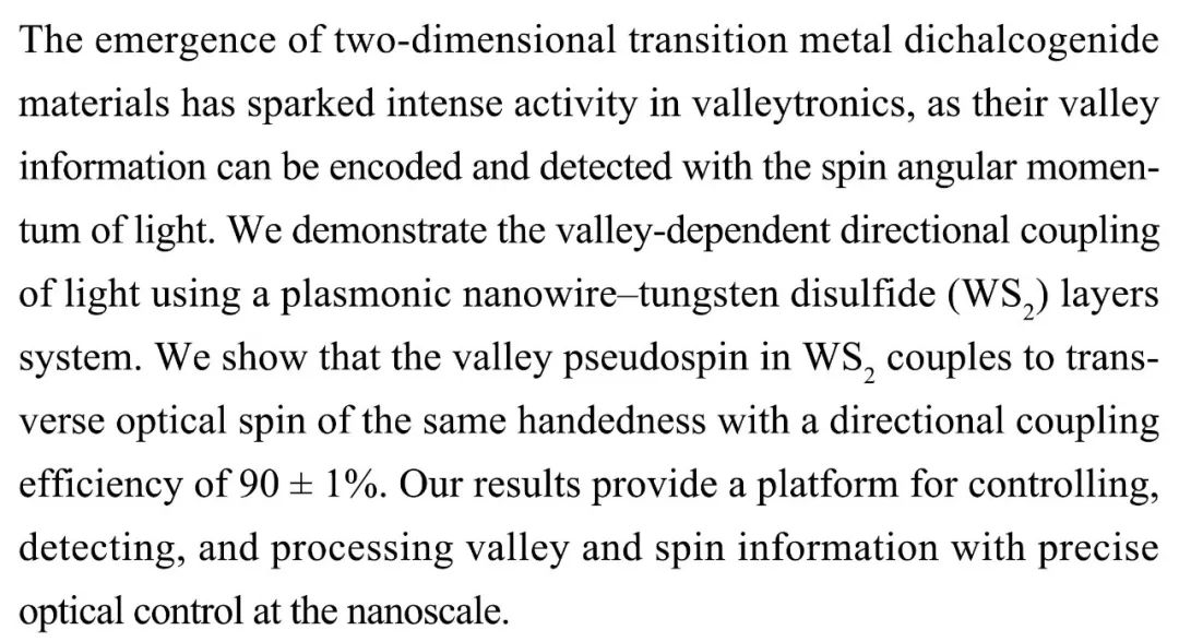 (导读 阿金)二维过渡金属双硫族化合物材料的能谷信息可以用光的自旋角动量编码并检测。本研究使用等离子纳米线-二硫化钨(WS2)层系统展示能谷依赖的光定向耦合。 WS2 中的谷赝自旋耦合相同手性的横向光子自旋,耦合效率达到 90 ± 1%。研究结果为调控、检测和处理电子能谷和自旋信息提供平台。