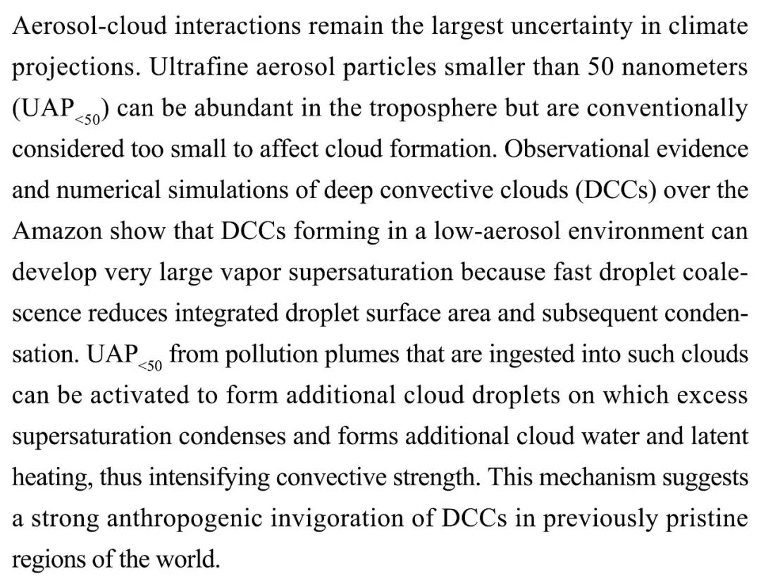 (导读 刘晓娟)一般认为富集在对流层的超细气溶胶粒子(UAP<50)不会影响云的形成。我们对亚马逊地区深对流云(DCCs)进行观测和模拟,表明在低气溶胶环境下 DCCs 形成过程易产生大量的过饱和水汽。污染羽流中的 UAP<50 能促进 DCCs 中微小云滴的形成,而云滴能够加速过饱和凝聚体、形成更多的云水和潜热,进而强化对流强度。这种机制表明人类活动能在 DCCs 形成中产生明显的增益效果。