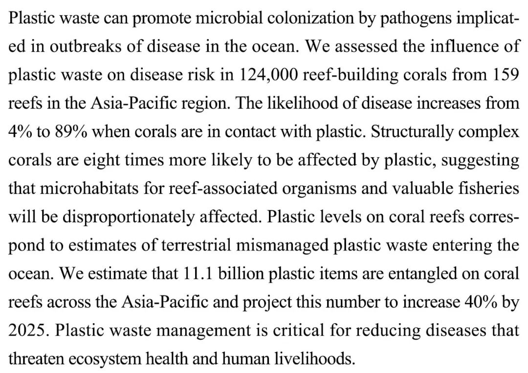 (导读 寒雨)保护珊瑚礁免受塑料废物影响已迫在眉睫。塑料废物可以促进与海洋疾病爆发相关的病原体微生物定植。本文以亚太地区 159 个珊瑚礁的 12.4 万只造礁珊瑚为研究对象,发现塑料废物导致珊瑚患病的可能性增加了 20 多倍,结构复杂的珊瑚受塑料影响的可能性增至 8 倍。珊瑚礁上的塑料来自处理不当的陆地塑料废物,预计到 2025 年,其数量将在 111 亿的基础上增加 40%。