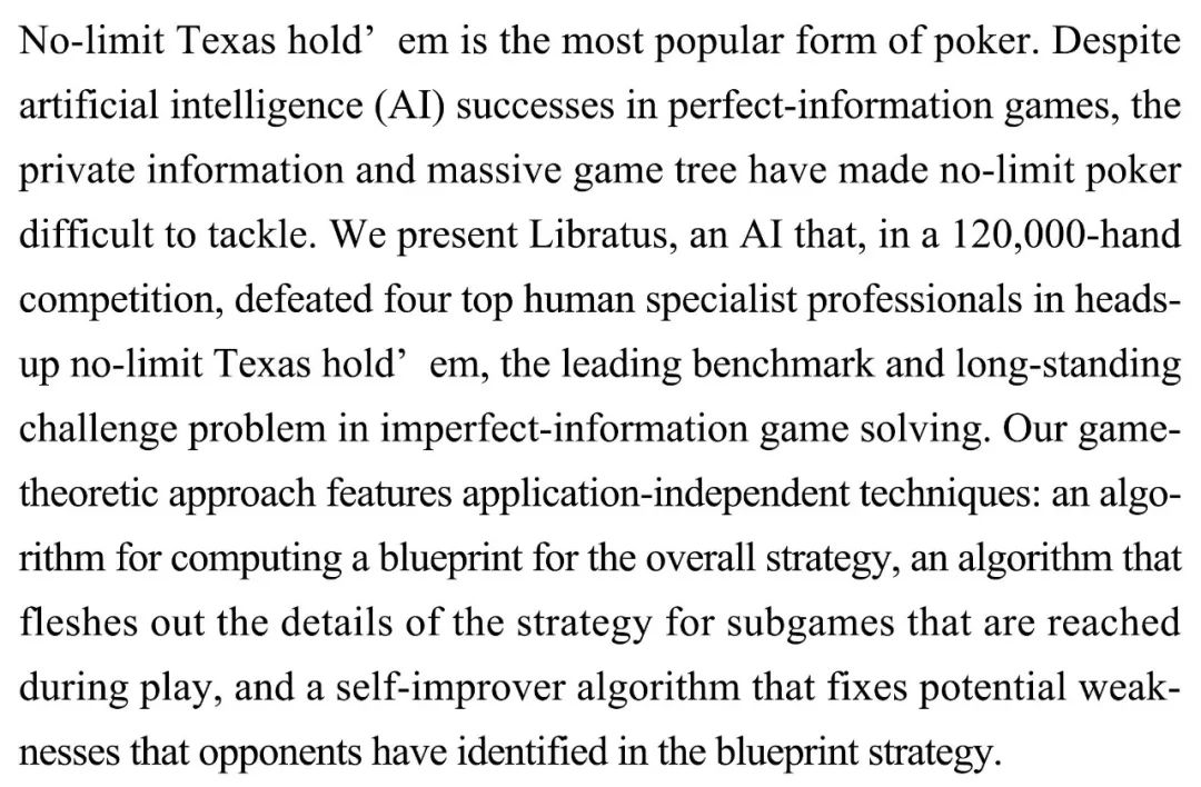 (导读 雷鸣)一对一无限注德州扑克(HUNL)是典型的不完全信息博弈游戏,加之庞大的博弈树,而成为人工智能长期以来难以攻克的挑战。本文报道了超级人工智能系统 Libratus 通过 120000 手 PK,击败四位 HUNL 顶级专业玩家。该系统采用应用独立技术:预设全局战略、实战中生成子战略、向对手学习修复战略漏洞。