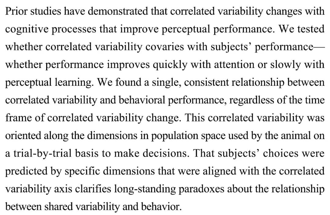 (导读 郭怿暄)曾有研究表明相关变异性会随着认知过程改变并提高认知表现。本研究试图探索相关变异性与被试主体表现是否存在共变,即认知表现会随着注意力迅速提高还是随着感知学习缓慢改善。结果显示不管时间范围,相关变异性和行为表现存在单一不变的关系。相关变异性与动物参与做出决定所运用的神经群体空间维度保持一致,研究主体的选择可由与相关变异性轴相一致的特定维度来预测。