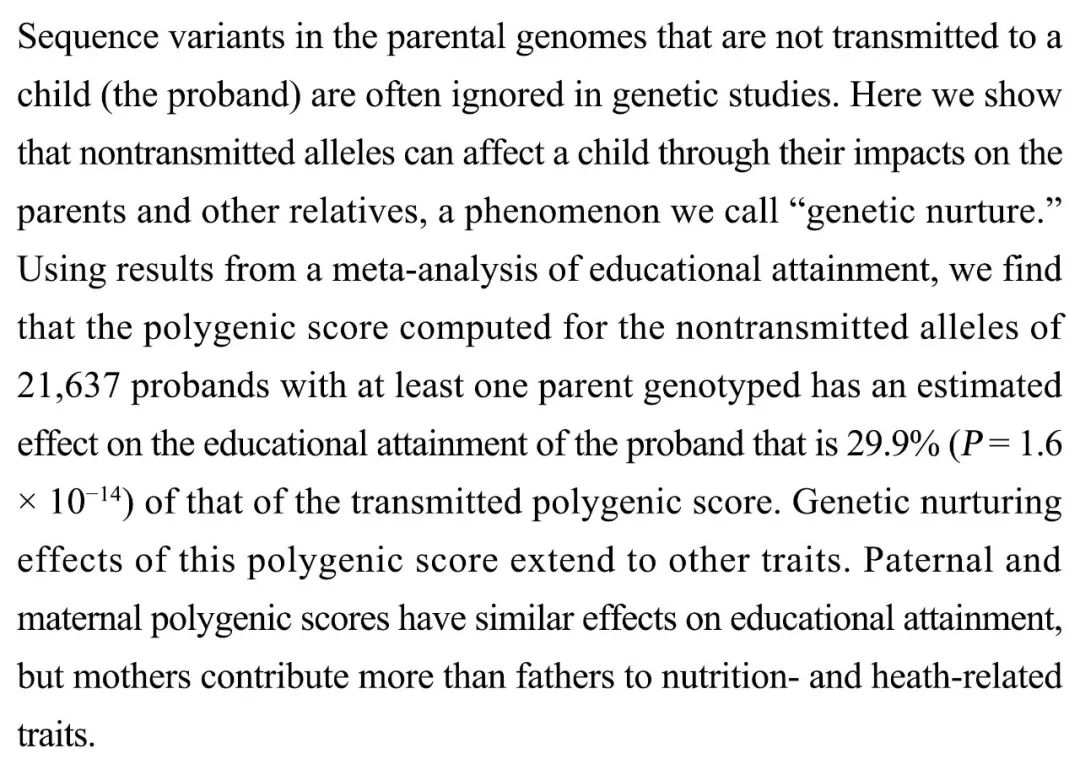 (导读 郭怿暄)以往的遗传学研究中,父母基因组中未传递到子代中的序列变异往往被忽略。本研究通过对双亲中至少一位基因型确定的 21637 位被试者的非传递等位基因进行多基因得分计算,评价其对被试者教育程度的影响,提出了“基因培育”现象,即,非传递等位基因可以通过影响父母和其他亲属来影响孩子