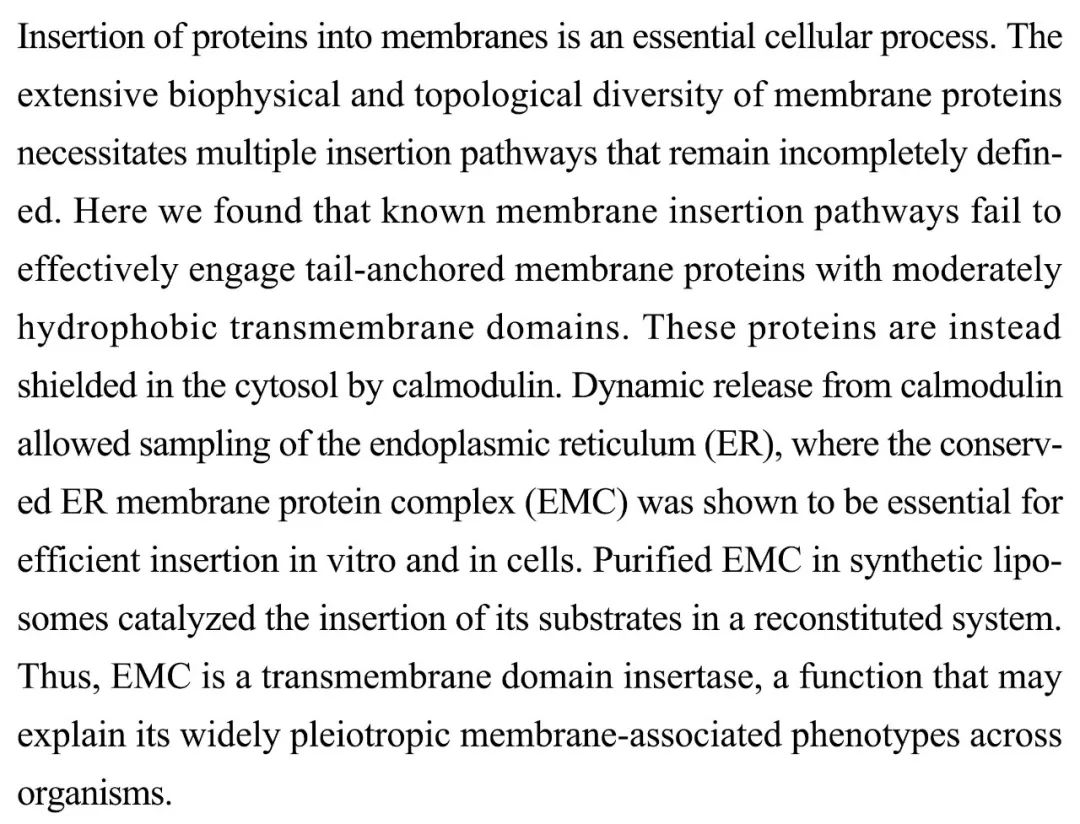(导读 郭怿暄)蛋白质插入膜结构是一项基本的细胞活动。本研究发现现有已知的膜插入通路无法将尾端锚定并含有中度疏水跨膜区的膜蛋白有效插入生物膜,这些蛋白在细胞质中被钙调蛋白所保护,被钙调蛋白释放后则通过内质网膜蛋白复合物(EMC)完成插膜。细胞中和体外重构实验都证实了 EMC 的插膜酶属性。