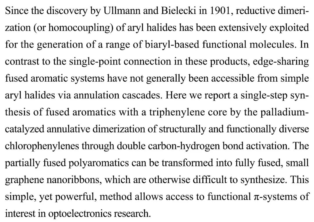 (导读 卓思琪)目前还没有利用芳卤反应生成稠环芳香系统的方法。本文报道了一个合成三亚苯为母核的芳稠环的一步反应。反应在钯催化下激活两个碳氢键的活性,使芳氯完成环化二聚反应。反应合成的部分稠合多环芳烃可以进一步转变为完全稠合多环芳烃。该反应对光电领域功能性 π 系统的研究有所助益。