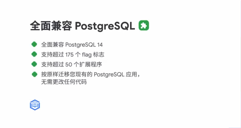 全面兼容 PostgreSQL:AlloyDB 与 PostgreSQL 全面兼容,支持超过 175 个 flag 标志和超过 50 个扩展程序。