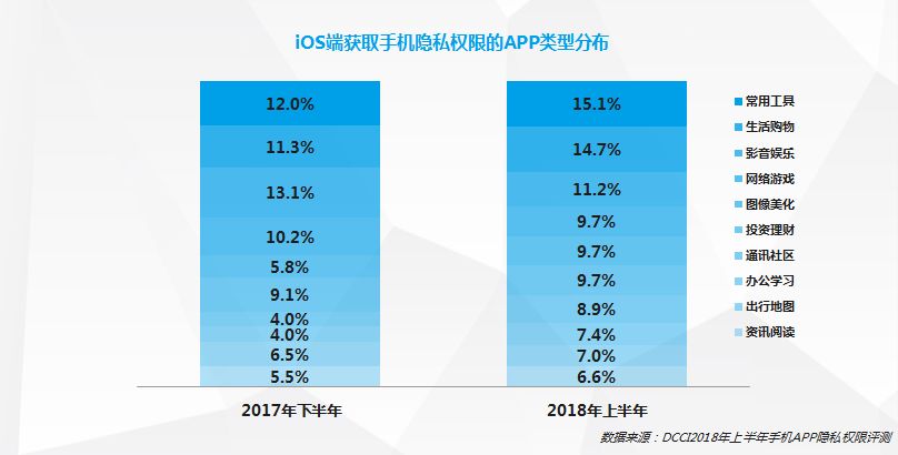 据评测发现,iOS 端获取手机隐私权限的 App 中,常用工具类、生活购物类和影音娱乐类 App 占比最大,分别占 15.1%、14.7% 和 11.2%。