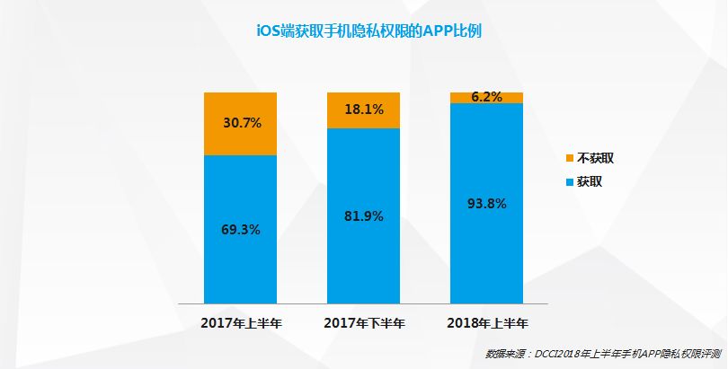 调查发现,iOS 端获取手机隐私权限的 App 比例正在呈现上升趋势,2018 年上半年 iOS 端获取手机隐私权限的 App 比例已达到 93.8%。仅仅时隔一年左右,iOS 端获取手机隐私权限的 App 比例增加了 24.5%。