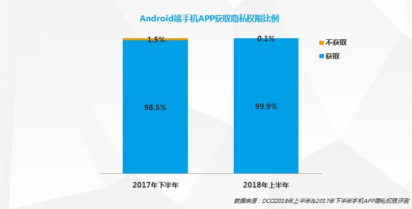 评测发现,2018 年上半年 Android 端获取隐私权限的手机 App 占比相较于 2017 年下半年提高了 1.4%,达到 99.9%,未获取隐私权限的手机 App 仅占 0.1%——几乎所有的 Android 端手机 App 都会获取隐私权限。