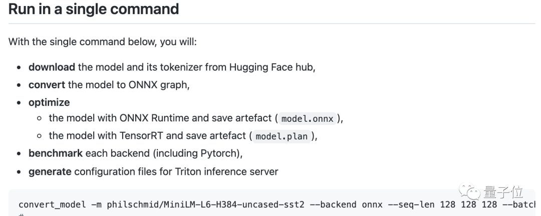 它可以用一行命令优化和部署Hugging Face上的Transformer模型,并支持大多数基于Transformer编码器的模型,比如Bert、Roberta、miniLM、Camembert、Albert、XLM-R、Distilbert等。