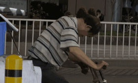 他步伐缓慢、一瘸一拐,靠骑小三轮载客为生。
