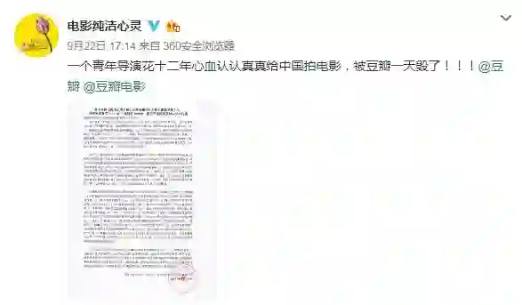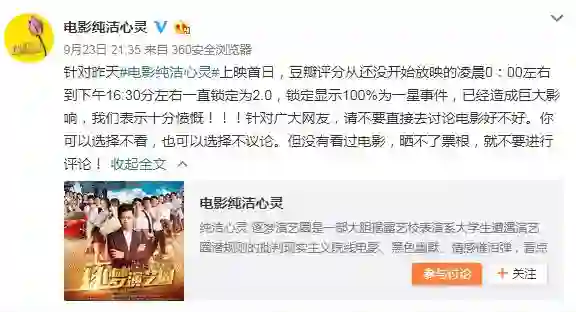 9月22日,而获得极低评分后,该电影官方微博帐号“电影纯洁心灵”在微博发函表示愤慨并要求豆瓣道歉:“一个青年导演花十二年心血认认真真给中国拍电影,被豆瓣一天毁了!!!”