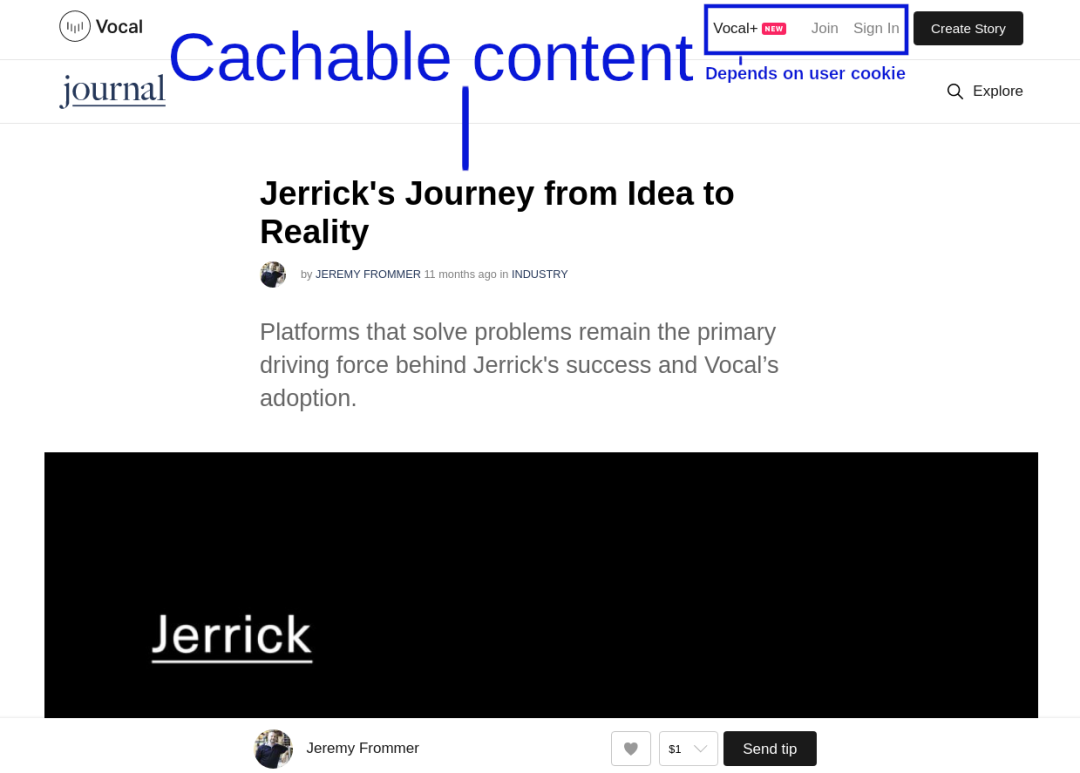 作为博客平台,大多数 Vocal 数据都是很容易缓存的;但是在旧站点中,由于右上角的一个菜单栏,几乎没有哪个页面可以缓存。对于匿名用户,菜单栏将显示邀请用户登录或创建帐户的链接。对于已登录用户,这个菜单会变为用户头像和个人资料菜单。由于页面会根据用户登录状态而显示不同内容,因此无法将其缓存在 CDN 中。