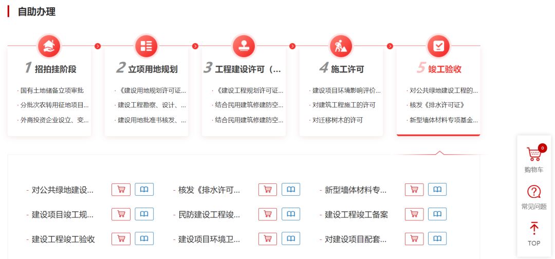 最后呈现的效果,则是企业在平台办事“像网购一样方便”,企业在每一个阶段对应的事项下方点击添加到购物车,每一个阶段的事项都可以一起办理。
