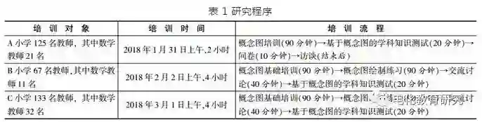 本研究选取了来自陕西省西安市三所小学的数学教师为研究对象。由于大部分教师对概念图比较陌生,本研究基于这三所学校组织的以概念图为主题的校本培训进行。研究程序见表1。