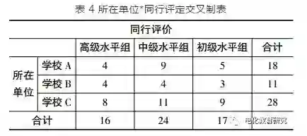 为了验证概念图用于小学数学教师学科知识评价的效度,本研究需要把概念图测评得分与同行评价进行相关分析。研究者对三校的教学主管领导和学科带头人进行了访谈,邀请他们对参与概念图测评的教师的学科知识水平一一进行等级评定,评定结果见表4。