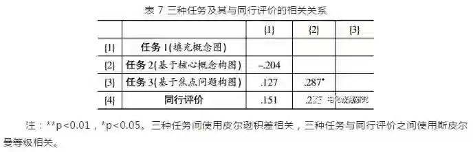 研究进一步分析了三种评价任务与同行评价的相关关系。由于三种任务得分均为连续变量,故采用积差相关计算三种任务得分间的相关关系。又由于同行评分为非连续变量,故采用等级相关计算其与三种得分间的相关关系(见表7)。结果表明,任务2(基于核心概念构图)和任务3(基于焦点问题构图)间呈现显著的弱相关,任务3(基于焦点问题构图)和同行评价间呈现极其显著的强相关,任务2(基于核心概念构图)和同行评价间只有临界显著的弱相关(p=.078),任务1与其他几种评价方式均无相关性。由于同行评价来自教师所在学校的专家教师,他们对教师的情况有着比较深入的了解,因而他们的评价比较可靠,这也表明任务3对教师学科知识评价较为精准,任务1几乎无法体现教师的学科知识水平。