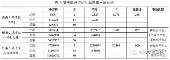 为了优化基于概念图的学科知识评价任务设计,我们以同行评价为分组依据,采用单因素方差分析研究三种类型的概念构图任务对三组教师的区分度。结果发现,三组教师在任务1上的表现无显著差异(p=.288),在任务2上有显著差异(p=.029),在任务3上有极其显著差异(p=.000)。事后比较发现,中级水平组和高级水平组教师在任务2上的表现无显著差异,三组教师在任务3上的表现均有显著差异(见表6)。
