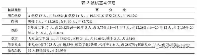 培训中面向数学教师发放基于概念图的学科知识评价任务,共发放测试卷64份(A校21份,B校11份,C校32份),有效回收57份(A校18份,B校11份,C校28份),有效率89.1%。有效被试基本信息见表2。