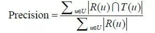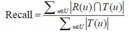 R(u)代表根据用户在训练集上的行为给用户做出的推荐列表,T(u)代表用户在测试集上的行为列表。