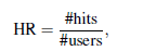 HR是目前TOP-N推荐研究中十分流行的评价指标,其公式如上所示,其中#users是用户总数,而#hits是测试集中的item出现在Top- N推荐列表中的用户数量。