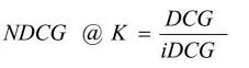由于在用户与用户之间,DCGs没有直接的可比性,所以我们要对它们进行归一化处理。最糟糕的情况是,当使用非负相关评分时DCG为0。为了得到最好的,我们把测试集中所有的条目置放在理想的次序下,采取的是前K项并计算它们的DCG。然后将原DCG除以理想状态下的DCG就可以得到「归一化折扣累计收益(Normalized Discounted Cumulative Gain,NDCG)」 ,它是一个0到1之间的数。