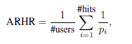 ARHR也是目前Top-N推荐中十分流行的指标,它是一种加权版本的HR,它衡量一个item被推荐的强度,公式如下: