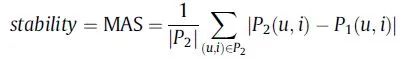预测和推荐的稳定性会影响用户对RS的信任,如果一个推荐系统提供的预测在短时间内没有发生强烈变化,则它是稳定的。Adomavicius和Zhang提出了稳定性的质量度量指标:Mean Absolute Shift(平均绝对位移,MAS)。