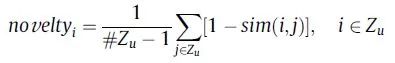 除了多样性以外,新颖性也是影响用户体验的重要指标之一。它指的是向用户推荐非热门非流行商品的能力。推荐流行的商品纵然可可能在一定程度上提高了推荐准确率但是却使得用户体验的满意度降低了。度量推荐新颖性最简单的方法是利用推荐商品的相似度。推荐列表中商品与用户已知商品的相似度越小,对于用户来说,其新颖性就越高。由此得到推荐新颖性指标: