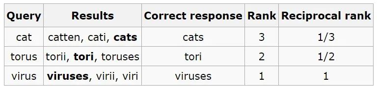 (黑体为返回结果中最匹配的一项),那么MRR值为:(1/3 + 1/2 + 1)/3 = 11/18=0.61
