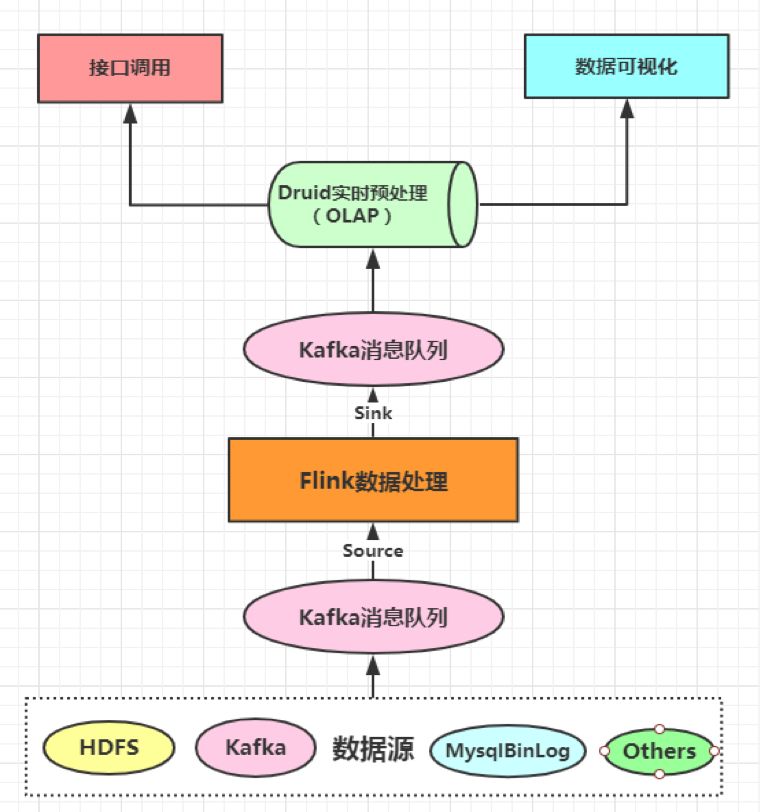 其次,使用Flink对接入的数据做operator操作,并将处理结果Sink暂存到另一个Kafka消息队列,供Druid做Pull拉取操作。