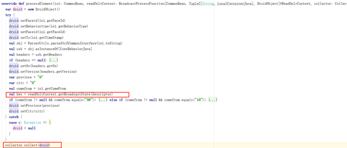 在抽象类BroadcastProcessFunction里,这里必须重写两个方法,一个是processBroadcastElement,一个是processElement,前者用以处理广播流,后者用以直接处理从Kafka读取的数据流,当然也可以重写 open和close方法,做一些初始化与收尾操作,具体根据自己的应用场景的需要来决定。