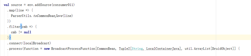 然后,使用connect将BroadcastStream 与Kafka传来的数据流合并,因为这两种流数据类型不同,所以使用connect多流合并,返回BroadcastConnectedStream。Flink的多流合并还有union和join等,union要求连接的流数据类型必须一致,join则要求每个流必须有key且key值相同才能完成关联操作。之后调用Process方法分别对各流做具体逻辑操作。因为我们的场景并不需要对数据集做Key分区,所以在Process方法里传入抽象类BroadcastProcessFunction的参数实现。
