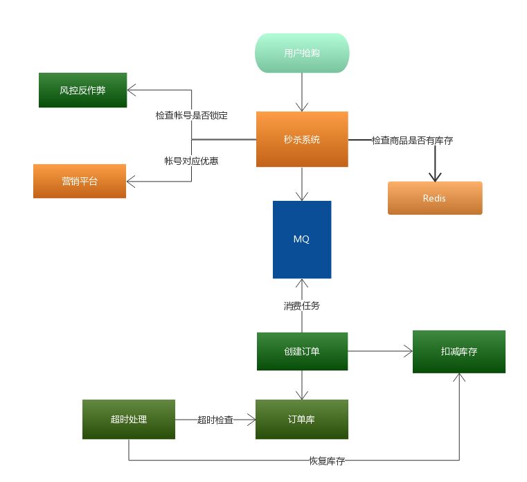 秒杀其实可以当做高并发系统来处理,在这个时候,可以考虑从业务上做兼容,将同步的业务,设计成异步处理的任务,提高网站的整体可用性