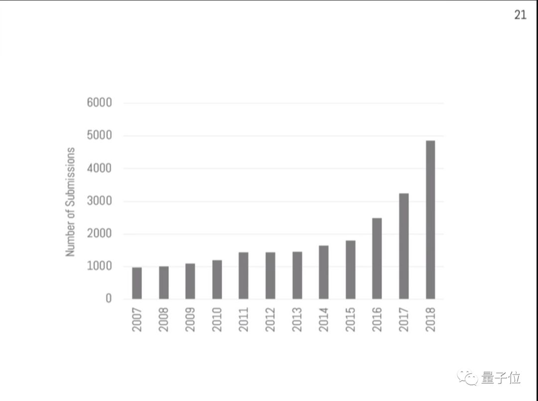 不仅参加人数多,NeurIPS 2018收到的投稿也涨到了4854篇,不仅和去年相比大幅增长,还是今年ICML的两倍。