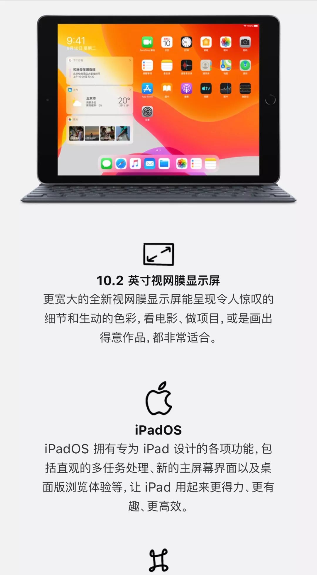 这次入门版的iPad最大的升级改变就是屏幕从9.7英寸升级至10.2英寸。并且支持了全尺寸智能键盘,配合iPadOS使用,比以往更加实用。