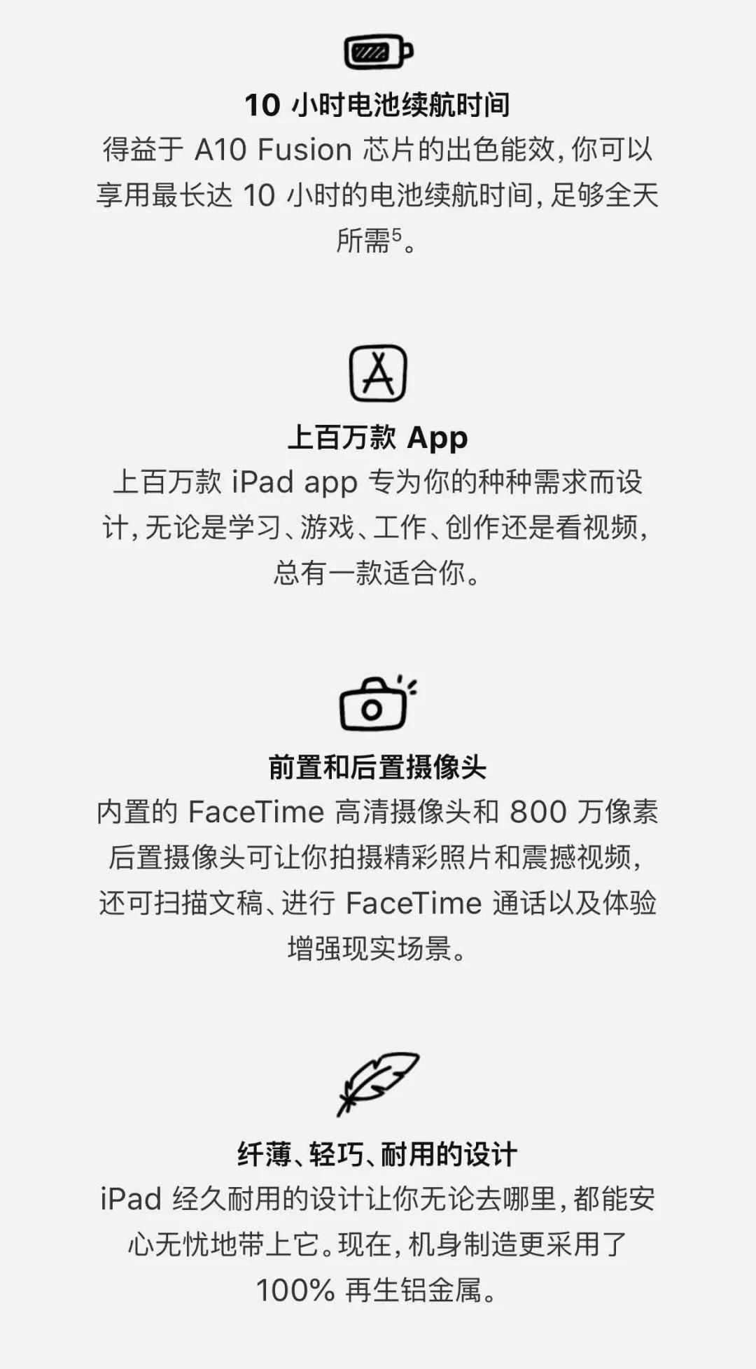 后置摄像头为800万像素,材质上,新iPad的机身采用了100%的再生回收铝金属打造。