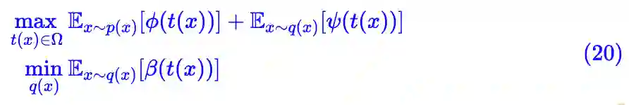 以及函数 α(t),β(t) 使得 d(r)=α(ω(r))+rβ(ω(r)) 是一个凸函数,或者使得 d(r) 是以 r=1 为最小值的函数,具备这些条件的的 ϕ(t),ψ(t),α(t),β(t) 就可以用来构建如下的 GAN 模型(其中