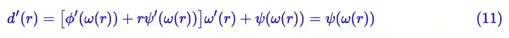 其中第二个等号是因为根据式 (8) 得方括号部分为 0。现在只剩 ψ(ω(r)) 一项了,并且留意到我们假设了 ψ′(t)=ρ(t)>0,所以 ψ(t) 是严格单调递增的,同时我们也假设了 ω(r) 是严格单调递增的,所以复合函数 ψ(ω(r)) 也是严格单调递增的。